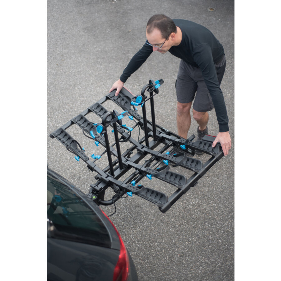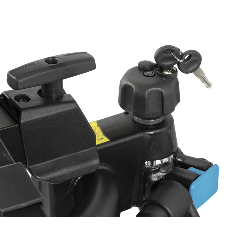 Pas besoin d´outil pour installer le porte-vélos sur l´attelage, une molette de serrage et un levier de verrouillage intégrés sécurisent l’installation en quelques tours de main. La molette est équipée d’une serrure antivol pour votre porte-vélos. Nous vous conseillons également de vous équiper d’un câble antivol afin de sécuriser vos vélos sur le porte-vélos.
