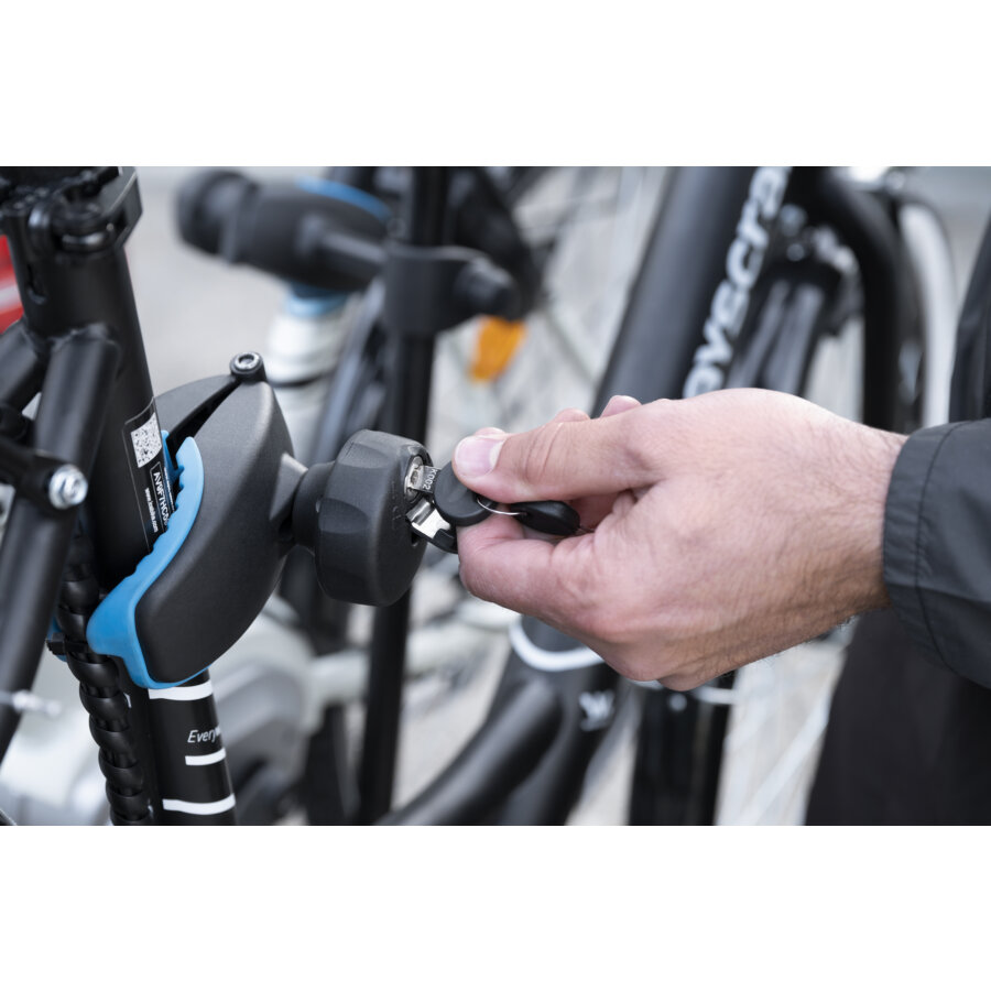 Pas besoin d’outil pour installer le porte-vélos sur l´attelage, une molette de serrage et un levier de verrouillage intégré vont sécuriser l’installation en quelques tours de main. La molette est d´ailleurs pourvue d´un verrou antivol qui pourrait vous être très utile le temps de votre randonnée.