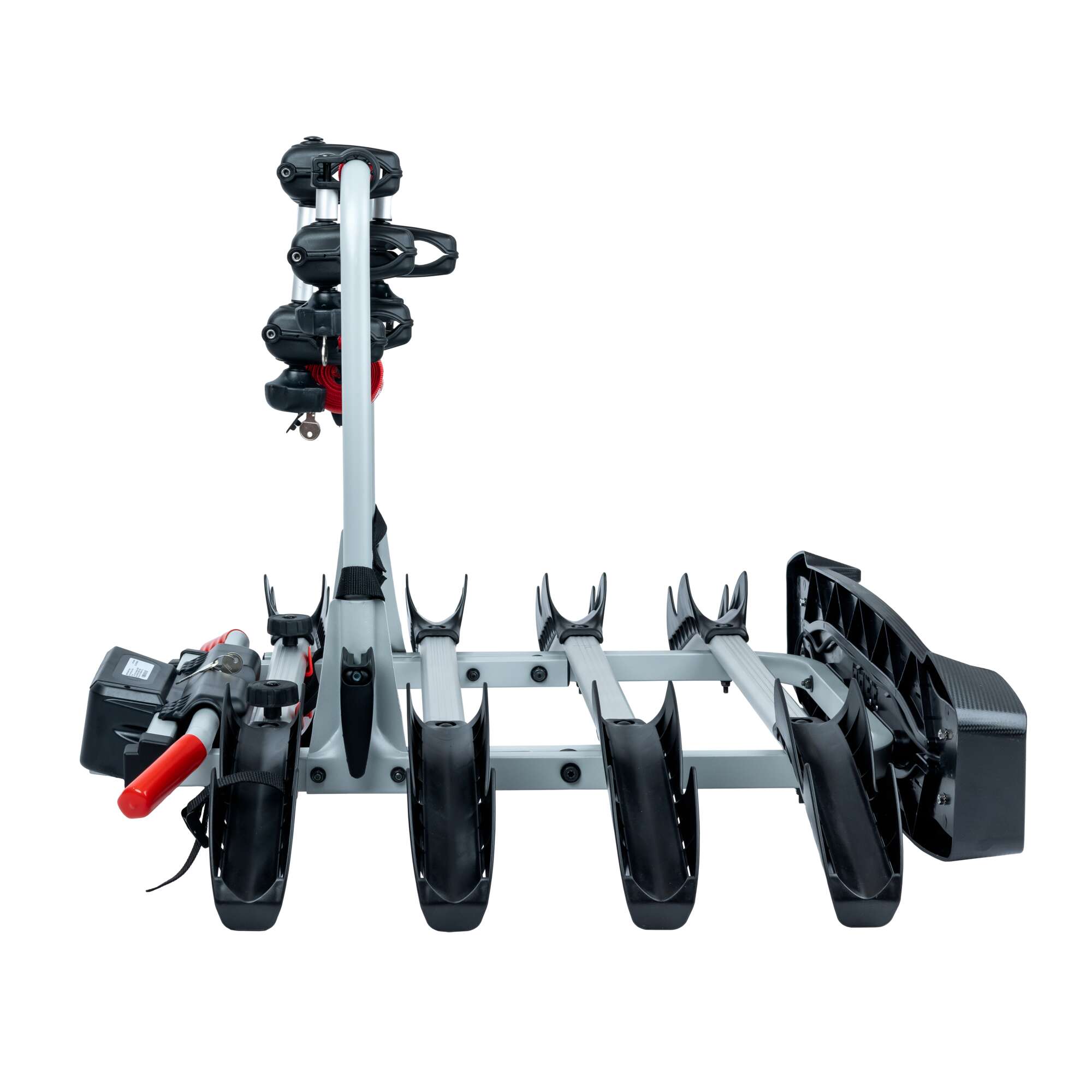 Inclinable, avec les vélos montés, donnant accès au coffre. Le porte-vélos TowVoyage Rapid 4 bras se verrouille sur la boule d’attelage, 2 clés incluses. Montage rapide sur tous les types de boule d’attelage d’un diamètre de 50 mm. Comprend des entretoises pour éviter tout contact entre les vélos.
