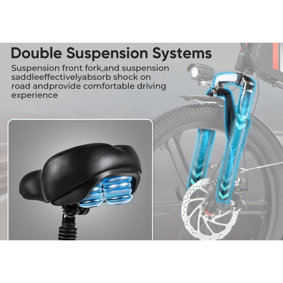 ✔︎  Double suspension (avant et tige de selle) – Confort optimal même sur terrains accidentés.