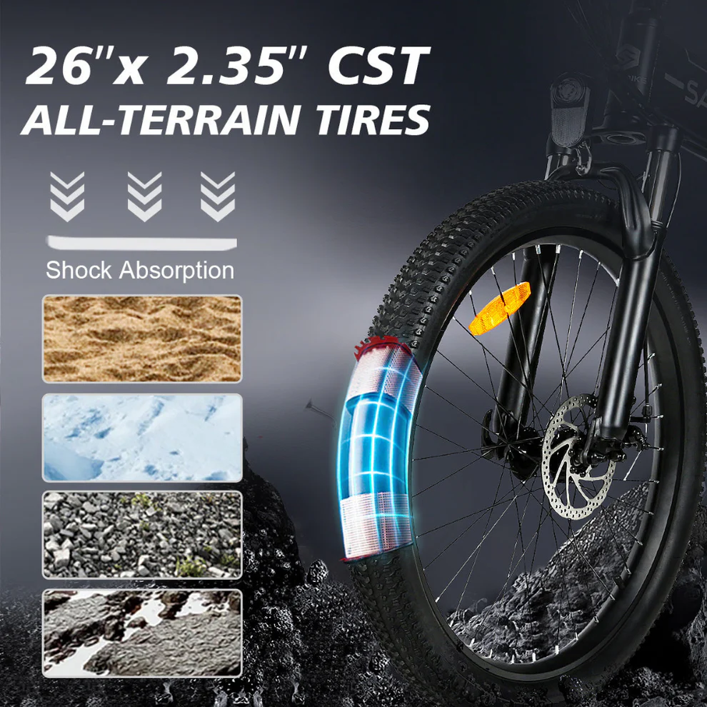 ✔︎ Pneus 26 x 2.35” – Stables et résistants, idéals pour tous types de terrains.