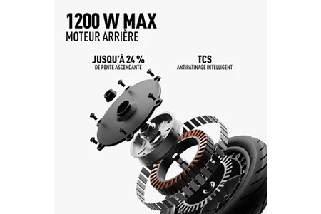 Le moteur sans balais de 1200 W à couple élevé offre des trajets fluides sur différents types de rues, tout en gravissant aisément les pentes jusqu’à 24%.