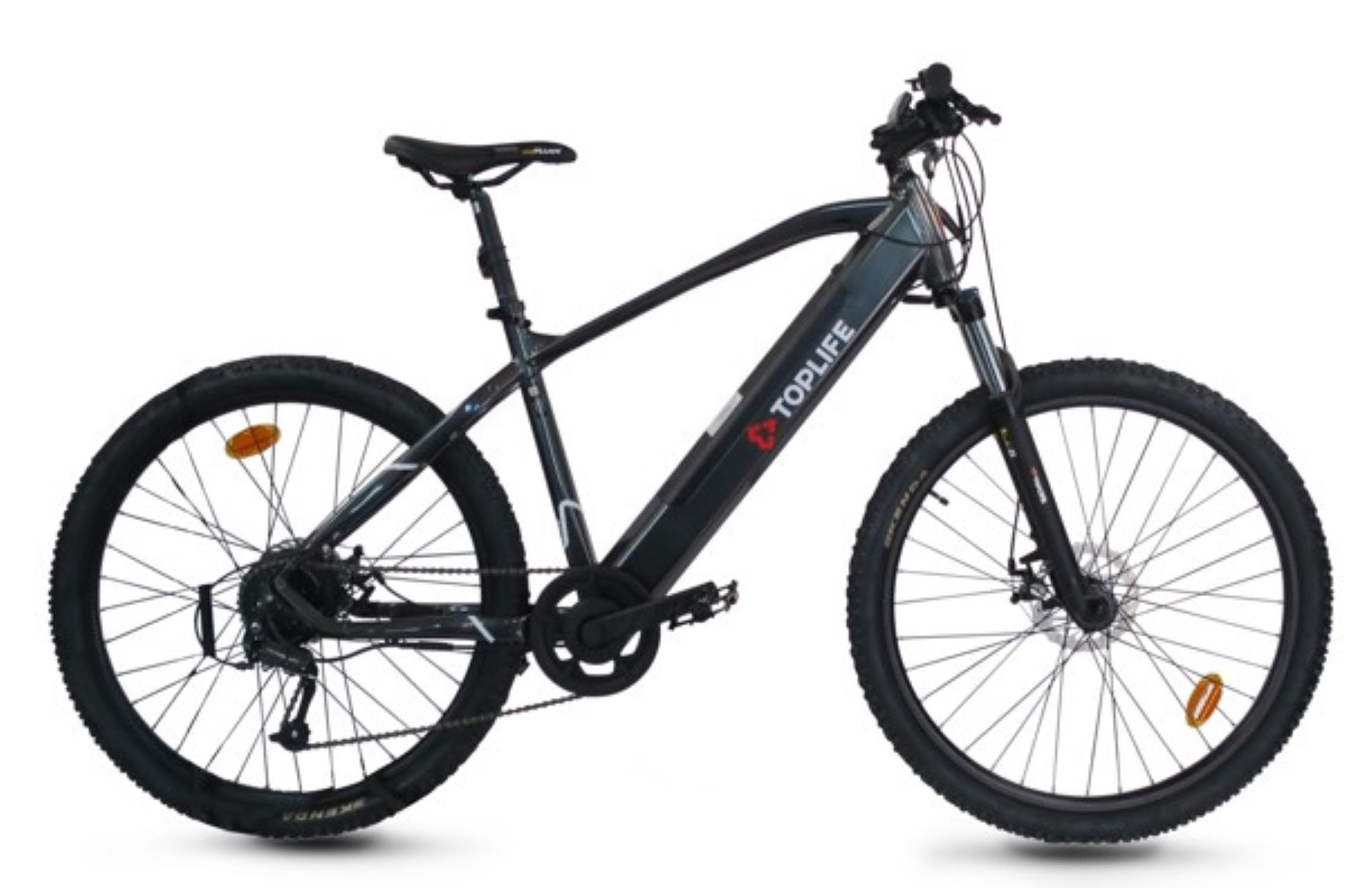 Le E-3400 TOPLIFE est un VTT à assistance électrique 27,5′ / Pneus MTB / Cadre aluminium / Moteur 36V-250W / Batterie intégrée 36v-13Ah lithium / Autonomie 80km / Display LCD / Dérailleur SHIMANO / Manettes SHIMANO 8 vitesses / lumières, sonnette, réflecteurs
