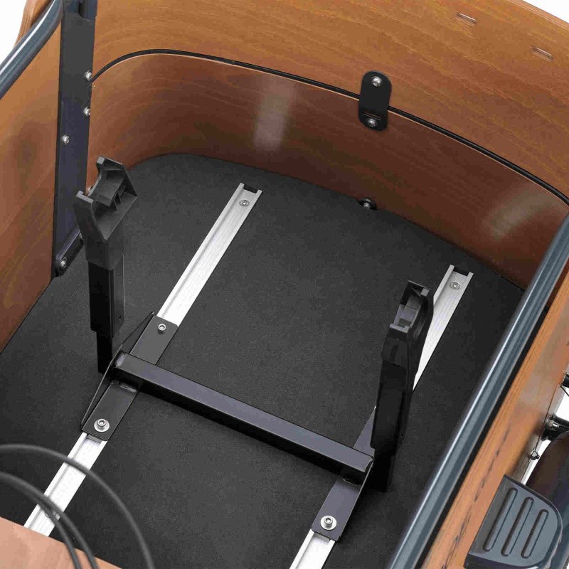 La caisse spacieuse est équipée d’un banc large offrant une assise sûre et confortable pour deux enfants.