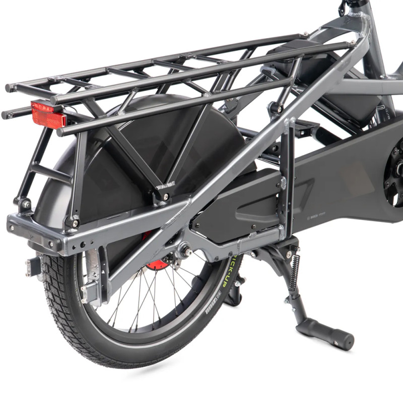 Ce vélo cargo électrique Tern GSD R14 est le fleuron de la gamme GSD, le mieux équipé de la série. Il sort le grand jeu avec le moyeu Rohloff électronique qui offre 14 vitesses, une large plage de développement et un confort d’utilisation au top. Ajoutez la courroie Gates CDX, qui peut couvrir des milliers de km sans bruit parasite et sans entretien décisif. Cette superbe liste est complétée par des freins Magura contrôlés par le système ABS Bosch. C’est un atout sur les freinages d’urgence, pour éviter de bloquer les roues et de perdre l’adhérence si vous tirez trop fort sur les leviers. Tern sélectionne enfin des pneus 20″ Schwalbe Pick-Up spécialisés dans le transport de lourdes charges.