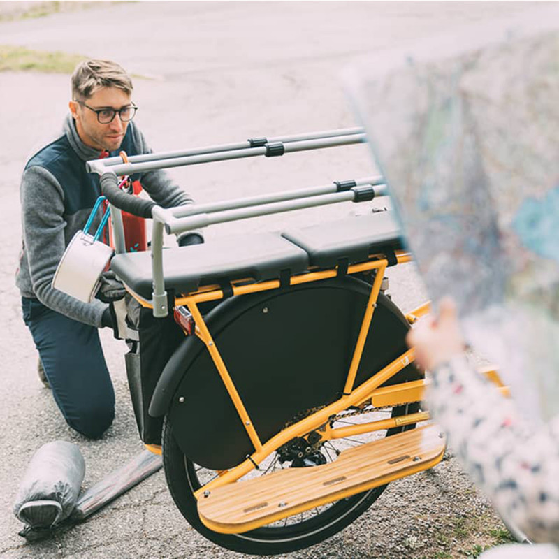 Présenté comme un vélo monospace ou un vélo mini-van, le cargo bike Yuba Electric Mundo EP8 est un modèle aménageable, grâce aux différentes options (voir la partie accessoires compatibles). Sa première mission consiste à transporter la petite famille, le plus souvent possible ! Il fait halte à l’école sur le chemin du bureau, il conduit les enfants à leurs activités, il part en balade et trouve facilement les meilleurs coins pique-nique. Lorsque les enfants sont occupés, le Yuba Electric Mundo EP8 sert à transporter quelques courses et colis volumineux, sur son long porte-bagages arrière.