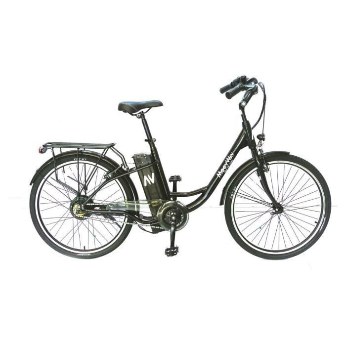 vélo MOOVWAY SOLAR : – Batterie 8 Ah, 36V – Moteur 200W – Vitesse Max : 25km/h – Autonomie de 20 à 35 km selon utilisation – Roues 26″ avec garde boue – Batterie amovible – Cadre Acier – 2 freins V brake – Compteur digital – Eclairage avant – Guidon et selle réglable en hauteur – Porte bagages