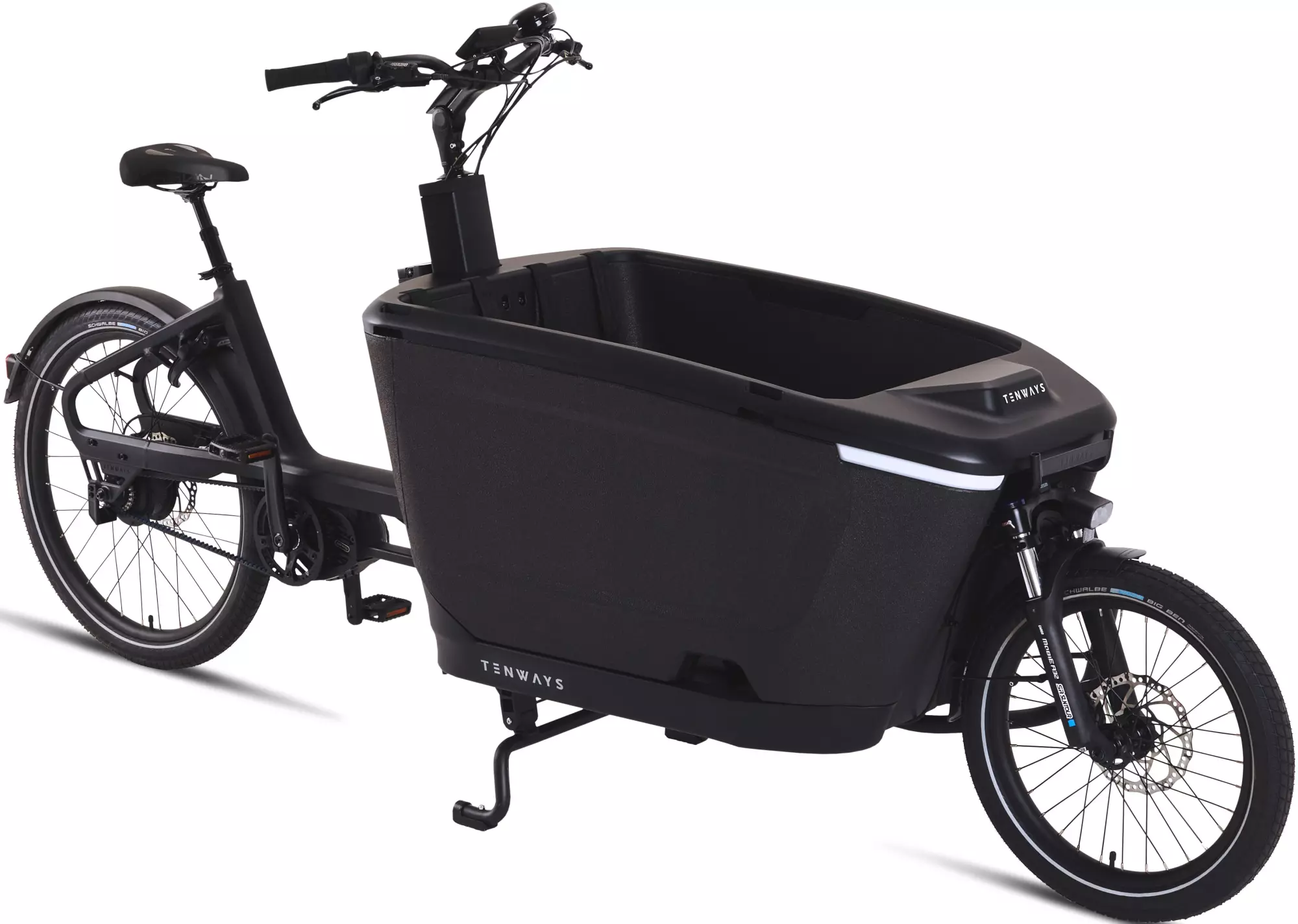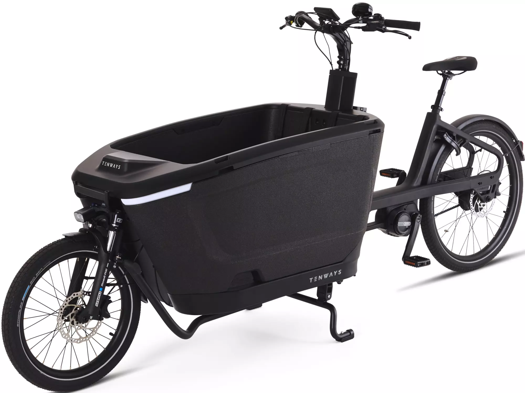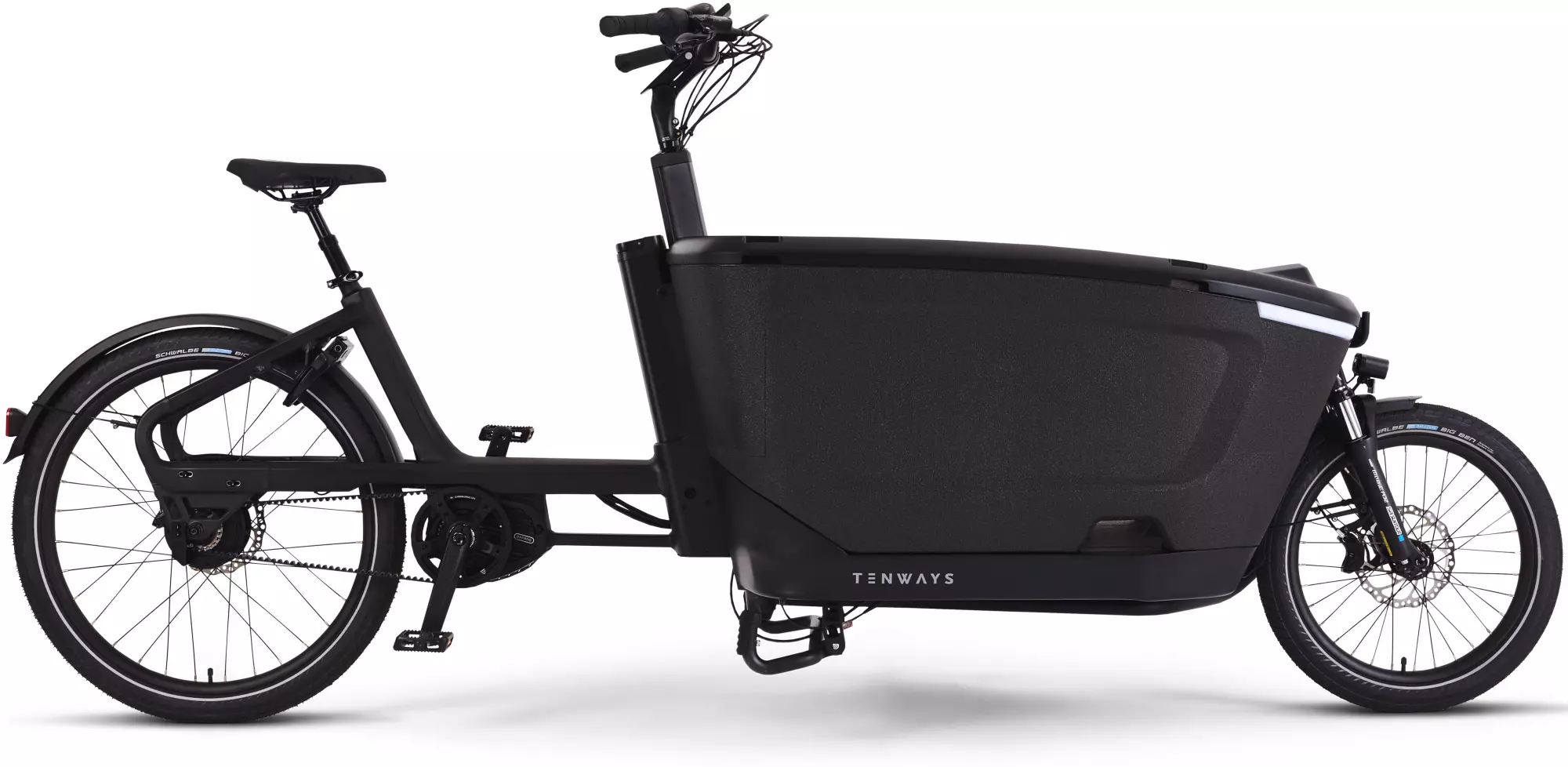 Avec sa large caisse de transport, son puissant moteur central et sa position de conduite confortable, le Tenways Cargo One offre une expérience de conduite fiable et agréable à celles et ceux qui souhaitent transporter des charges importantes ou des enfants. Grâce au moyeu à variation continue, à la transmission par courroie sans entretien et à la grande batterie, ce vélo cargo électrique se montre polyvalent et parfaitement adapté à un usage quotidien.