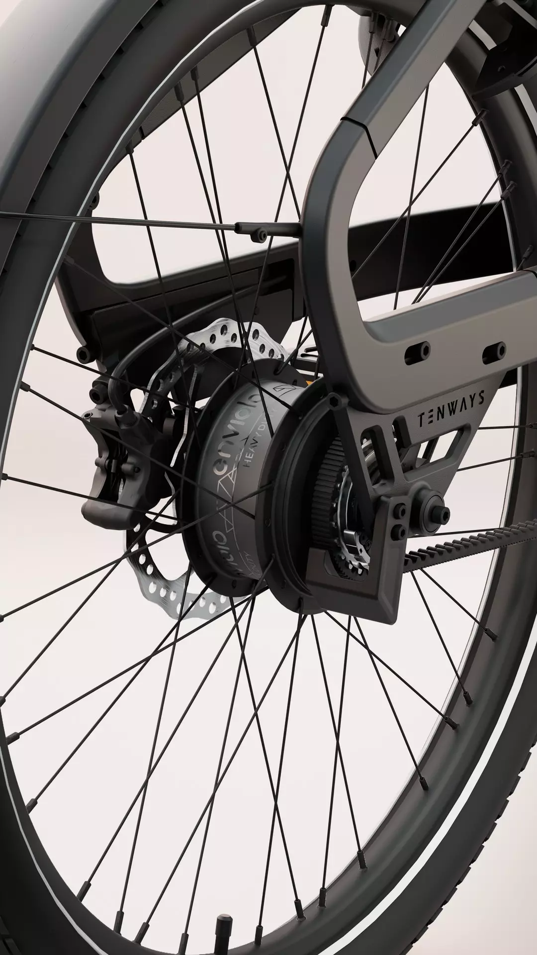 Le moyeu à variation continue Enviolo permet de changer de vitesses en continu, même à l’arrêt, afin que le Tenways Cargo-One soit toujours dans le bon développement au moment de repartir. Associé à la transmission par courroie Gates CDX en carbone, le système reste propre, silencieux et quasiment sans entretien. Le freinage est assuré par des freins à disque hydrauliques à quatre pistons, offrant une puissance de freinage élevée et fiable, y compris sous la pluie ou dans des conditions défavorables.