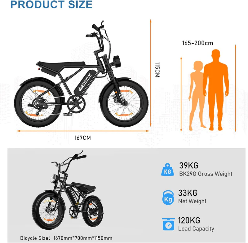 - Structure solide : la taille du corps du vélo est de 167*70*115 cm, la hauteur du siège par rapport au sol est d’environ 83-84 cm et le poids net est de 33 kg. Le cadre durable en acier au carbone peut résister aux dangers de diverses conditions de route et constituer un véhicule fiable au quotidien.
