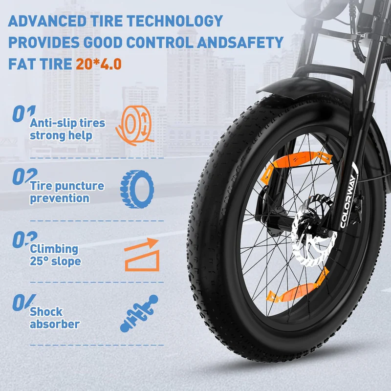 - Haute performance : équipé de pneus anti-crevaison de 20 × 4,0 pouces de large, il peut facilement gérer n’importe quel terrain. L’excellente fourche à suspension assure une conduite souple et confortable même sur les routes les plus accidentées