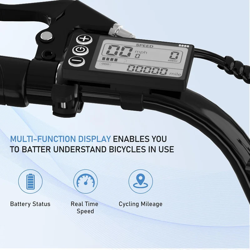 - Écran LCD : l’écran LCD intelligent permet de suivre en temps réel la vitesse, le niveau de la batterie, le kilométrage et d’autres données. Trois vitesses sont disponibles. Après avoir choisi la vitesse appropriée, vous pouvez rouler plus vite, plus facilement et vous amuser davantage