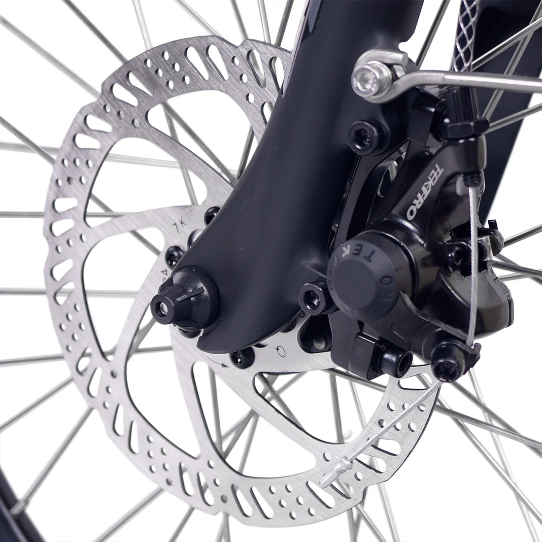 SÉCURITÉ ET CONFORT : Les freins à disque Tektro assurent un freinage en douceur, tandis que le phare Spanninga garantissent une conduite sûre dans des conditions de faible luminosité. La selle pliante est conçue pour un retrait facile de la batterie et est également très confortable grâce à une suspension intégrée. Un dérailleur arrière Shimano 7 vitesses maximise la fluidité.