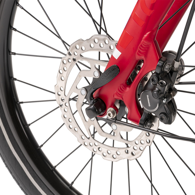 Habillé avec de nombreux accessoires (sonnette, béquille, éclairages, garde-boue), ce vélo pliant électrique Tern Vektron Q9 est équipé de freins à disque hydrauliques, d’un dérailleur Shimano Alivio 9 vitesses et de solides pneus Schwalbe Big Apple.