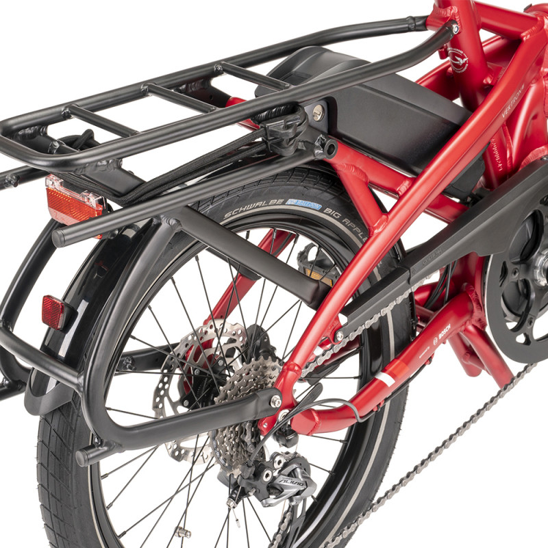 Le vélo pliant électrique Tern Vektron Q9 est équipé du solide porte-bagages Atlas Rack. Appréciable pour son design, bien dans l’allure générale du vélo, il offre surtout une plateforme de chargement robuste et adaptable. Capable de supporter jusqu’à 27 kg de charge, il peut accueillir vos sacoches et un siège vélo Thule (Yepp Maxi ou Nexxt Maxi).