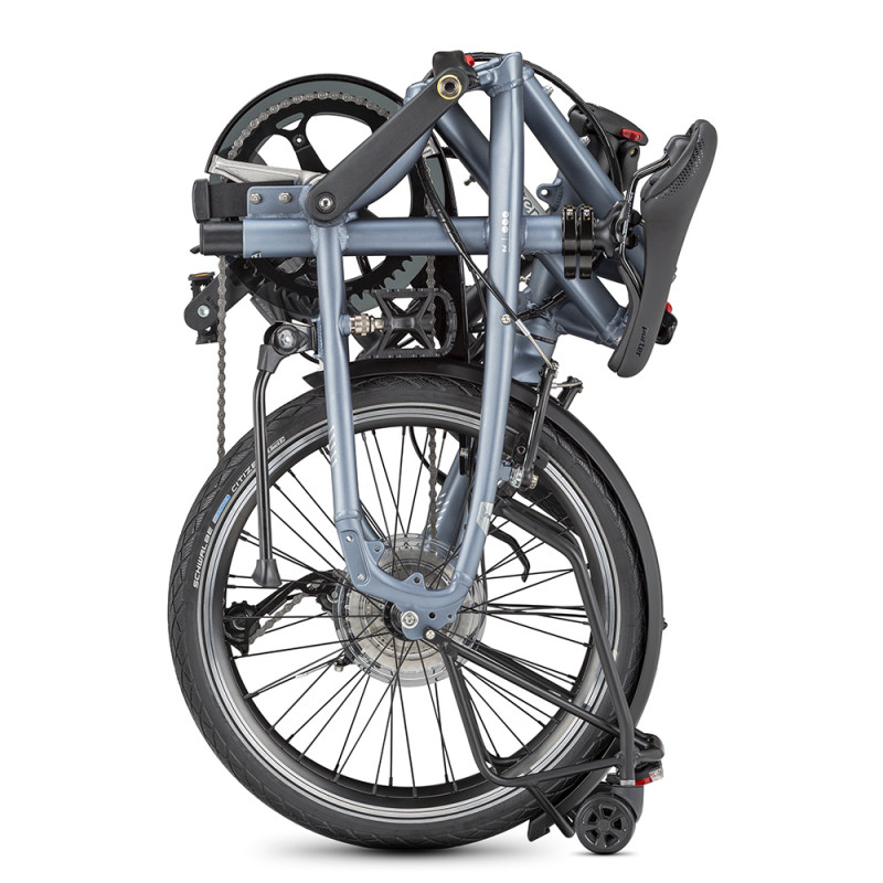 Ce vélo pliant Tern BYB P8 est aussi équipé d’un porte-bagages arrière Metro Transit, un modèle spécial qui présente une structure avec deux roulettes, permettant de garder le vélo pliant bien stable lorsqu’on le déplace à pied, comme un bagage roulant.
