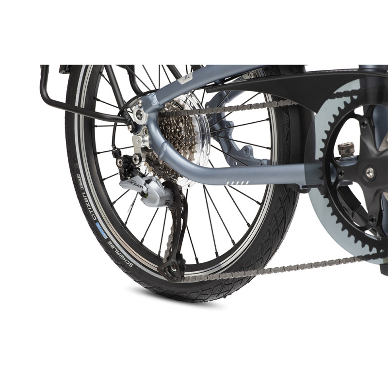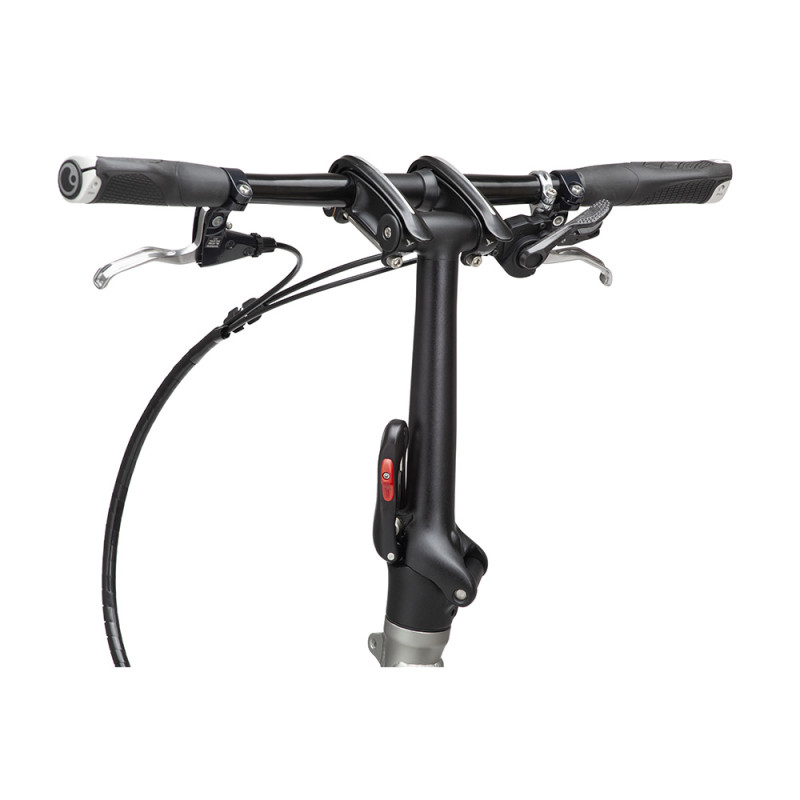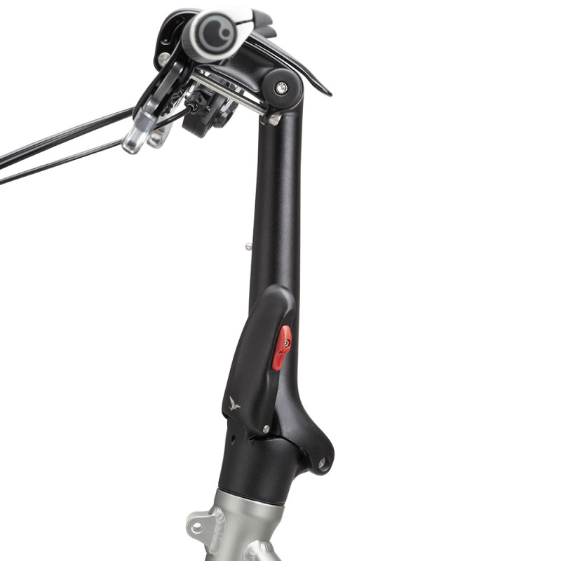 La plus fameuse technologie est assurément le système de pliage TriFold à deux points, sur l’avant et l’arrière du tube horizontal, avec les solides joints TFL. Le support de guidon Physis RF se replie également, tandis que la potence Andros peut être réglée facilement (sans outil) pour ajuster l’avancée du cintre. Grâce à ce système et au tube de selle largement réglable, ce seul vélo peut être enfourché par des cyclistes de tout gabarit, du plus petit (1,47 m) au plus grand (1,95 m) !