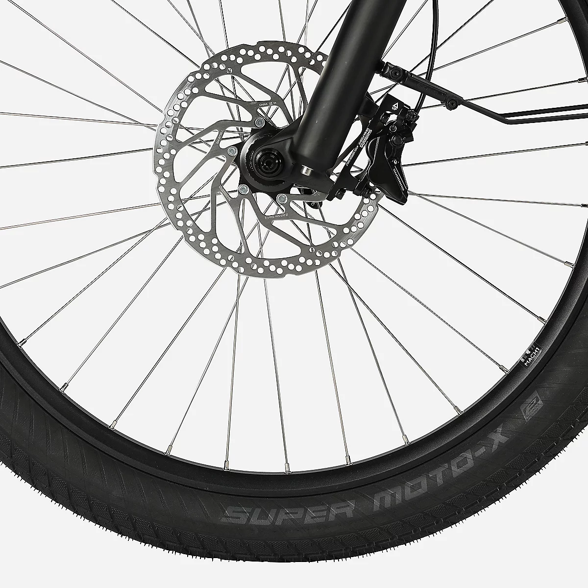 La fourche au débattement généreux de 120mm amorti tous les chocs et permet de garder le contrôle en toute circonstance. Au besoin, elle peut être bloquée.